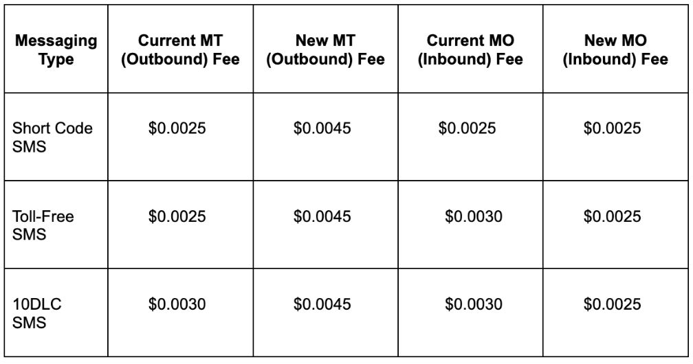 Short Code MO fees are unchanged, while 10DLC and Toll-Free SMS MO fees are set at $0.0025 per message.